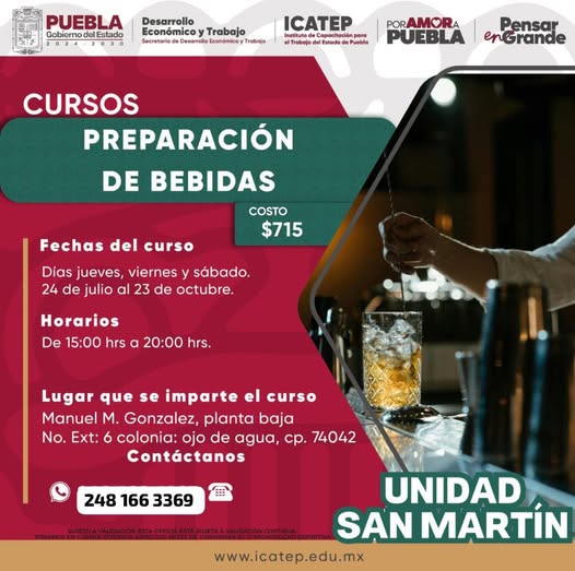 El ICATEP Unidad San Martín abre inscripciones para su curso de Preparación de Bebidas Fechas: Del 24 de julio al 23 de octubre Días: Jueves, viernes y sábado Horario: 15:00 a 20:00 hrs Costo total: ¡Solo $715 pesos! Lugar: Manuel M. González, planta baja, Col. Ojo de Agua, CP 74042 ¡Aparta tu lugar ya! 248 166 3369 Aprende técnicas, mezcla sabores y domina el arte de las bebidas como un profesional ¡Cupo limitado, no te lo pierdas! www.icatep.edu.mx